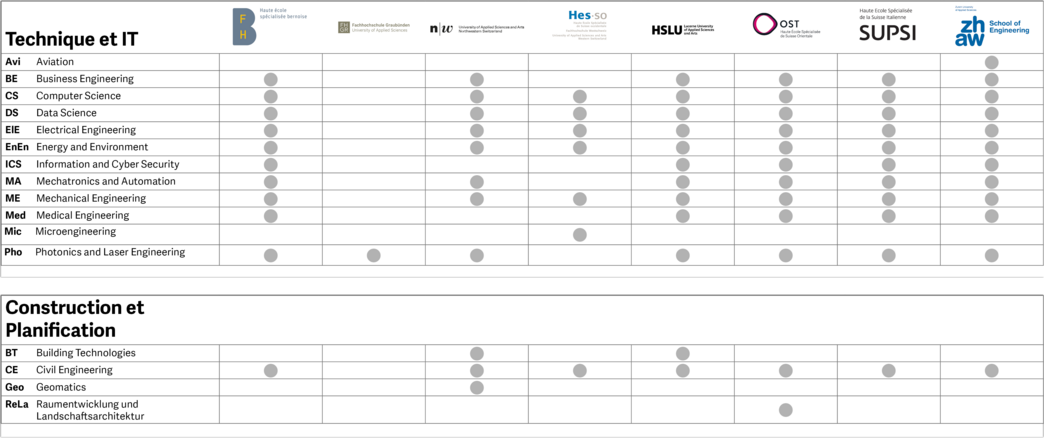 Les anciennes spécialisations suivantes sont également des titres de diplôme valides. "Master of Science [Nom HES] en Engineering avec orientation en [spécialisations]"